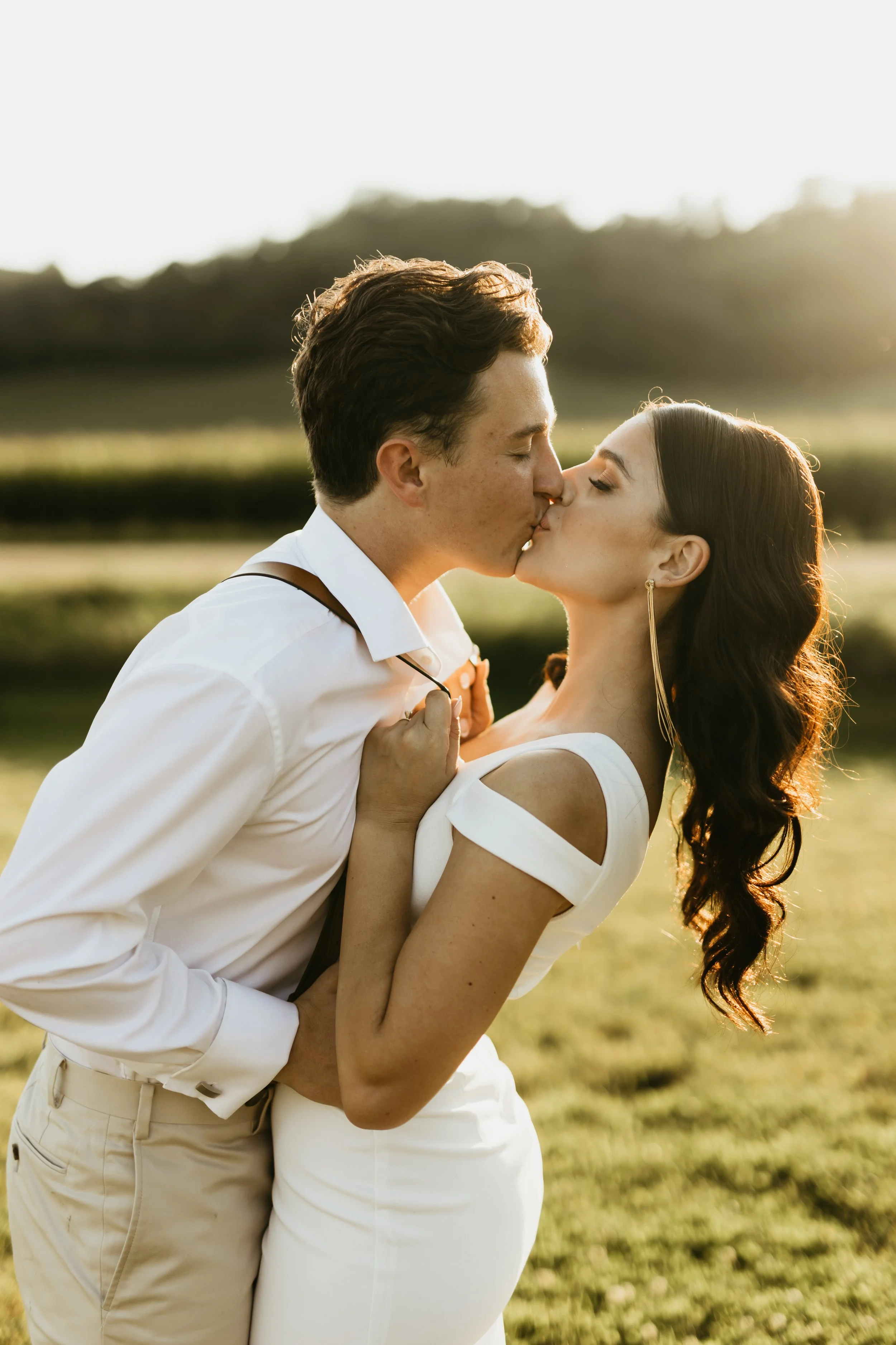 Bride and groom kissing in a field at sunset