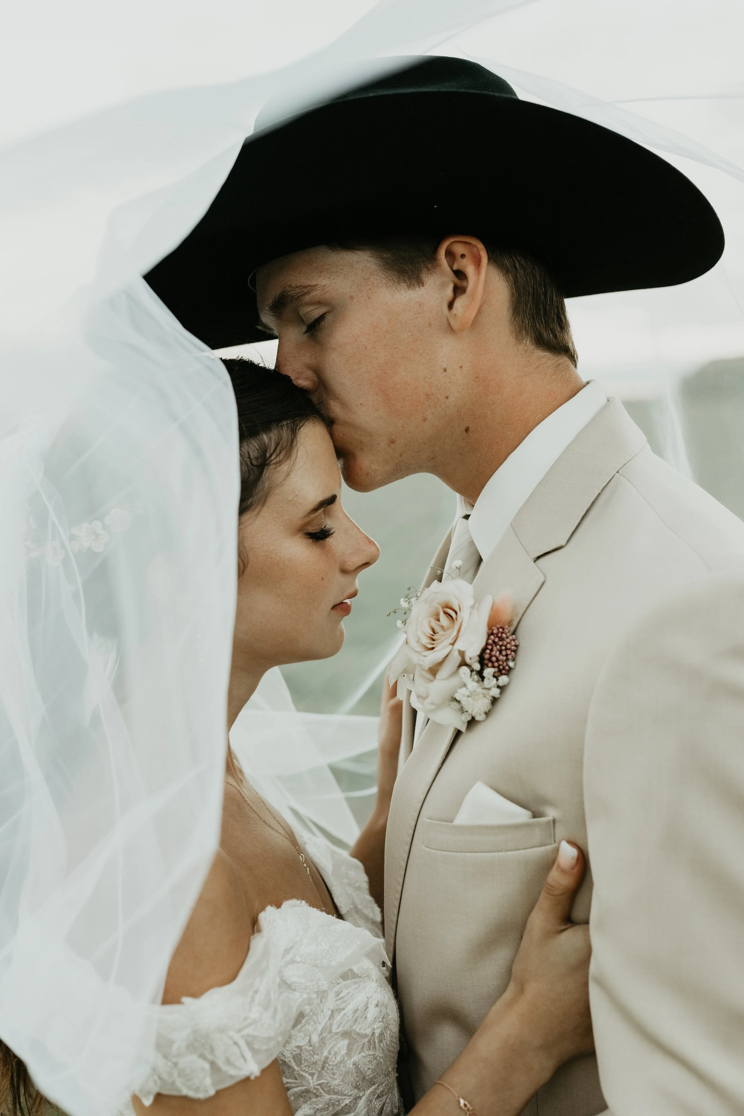 Couple leaning their foreheads together with their eyes closed under the bride's veil