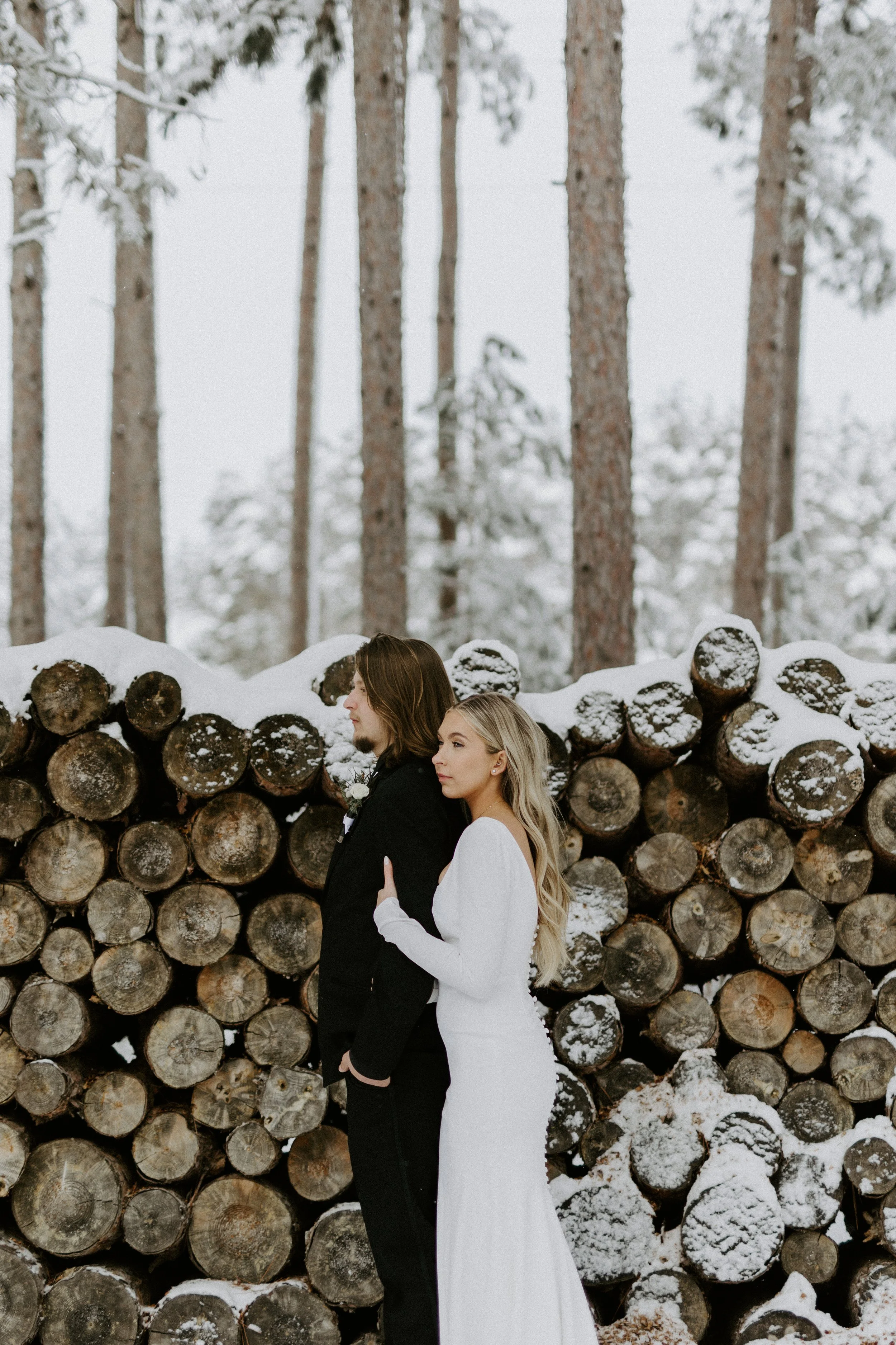 Couple standing in front of stacked wood in the snow