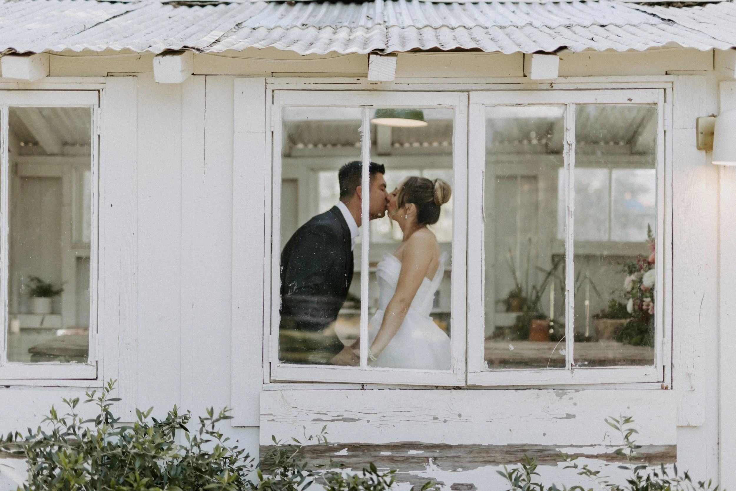 Couple kissing in a garden shed